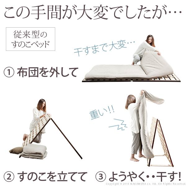 ※ すのこを立てた後は、掛け布団などをのせずにご使用ください。
