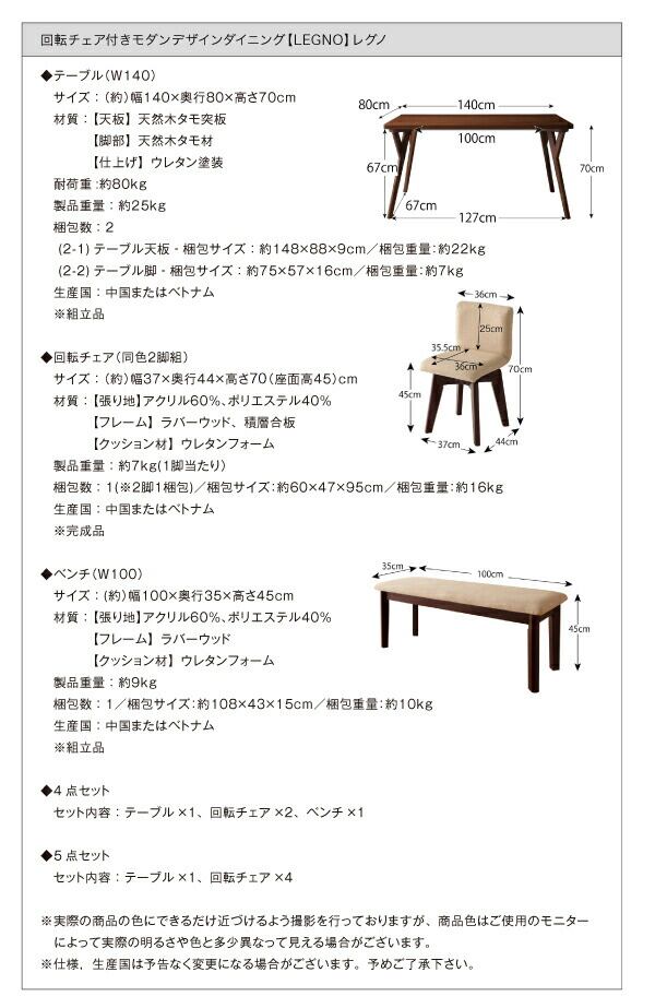 5点セット(テーブル+チェア4脚) W140