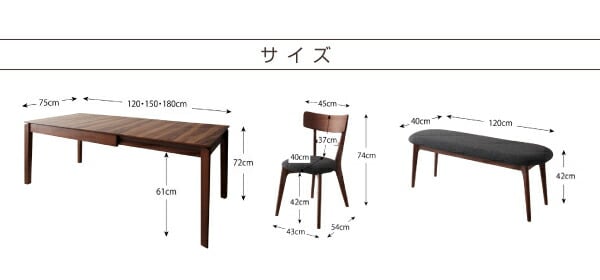 天然木ウォールナットエクステンションダイニング 4点セット(テーブル+チェア2脚+ベンチ1脚) W120-180