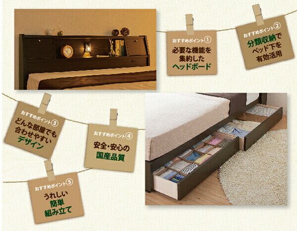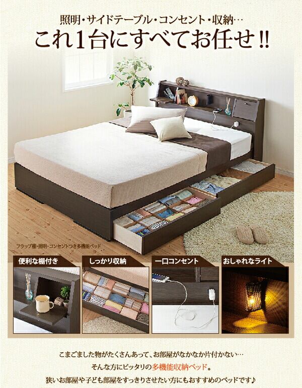フラップ棚・照明・コンセントつき多機能ベッド 天然ラテックス入り国産ポケットコイルマットレス付き シングル