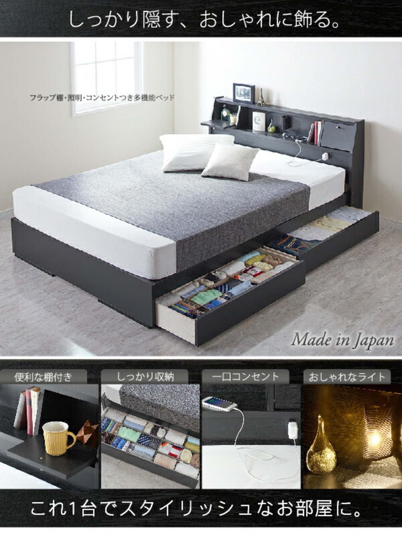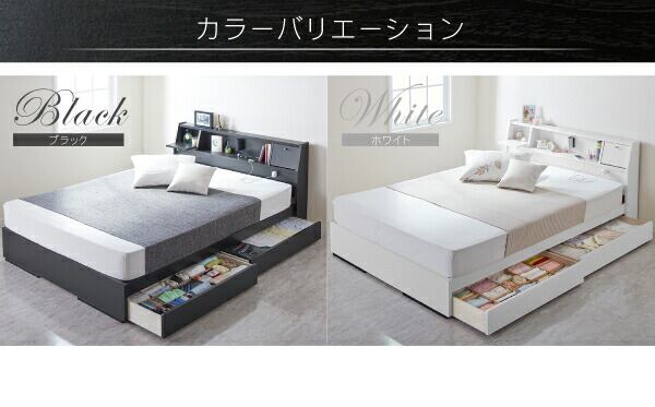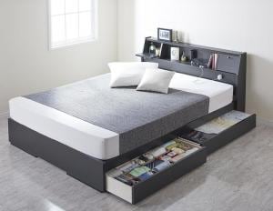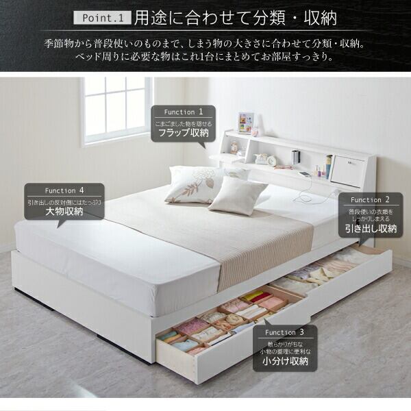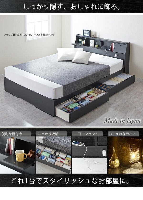 フラップ棚・照明・コンセントつき多機能ベッド ポケットコイルマットレス付き ダブル