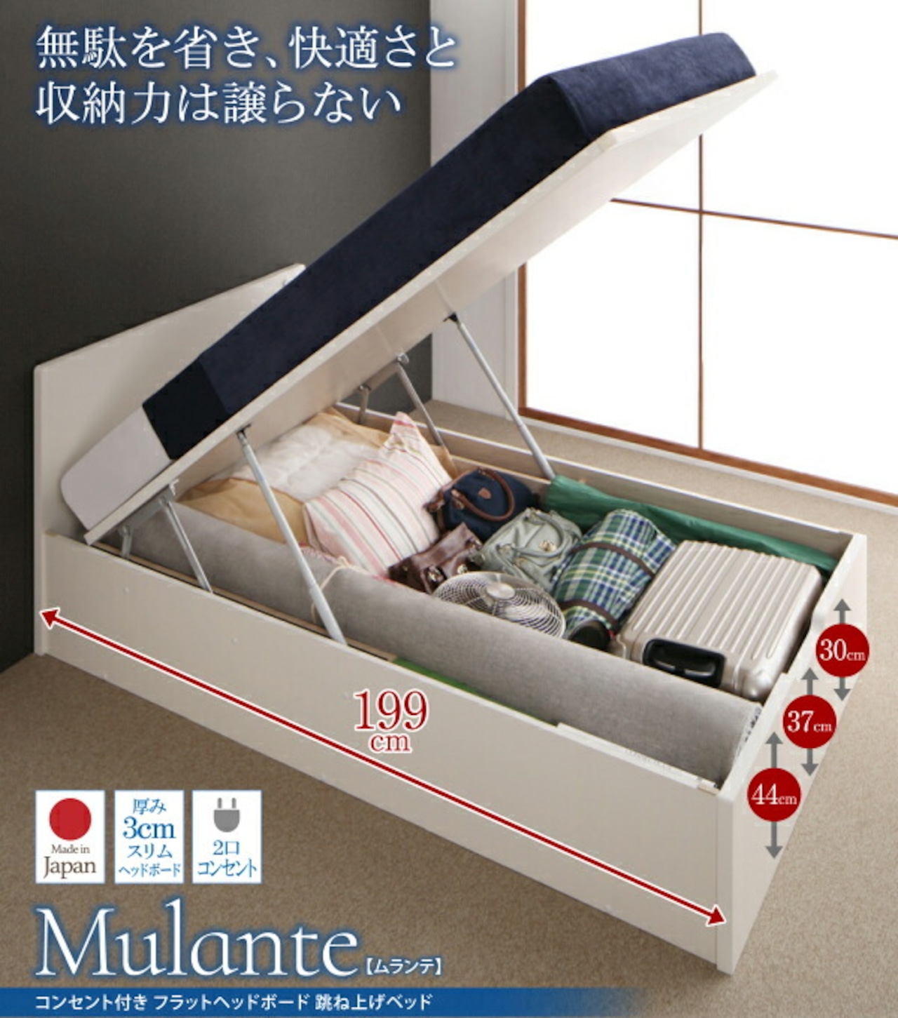 お客様組立 フラットヘッドコンセント付跳ね上げ収納ベッド 薄型スタンダードボンネルコイルマットレス付き シングル 深さレギュラー