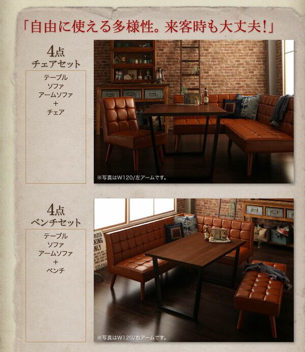 アメリカンヴィンテージ リビングダイニングセット 4点セット(テーブル+ソファ1脚+アームソファ1脚+チェア1脚) 左アーム W120