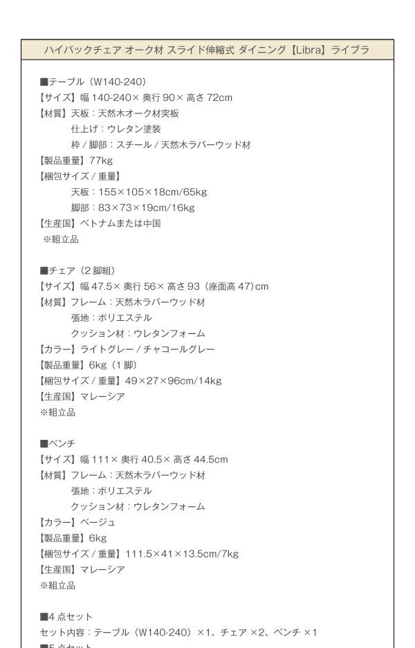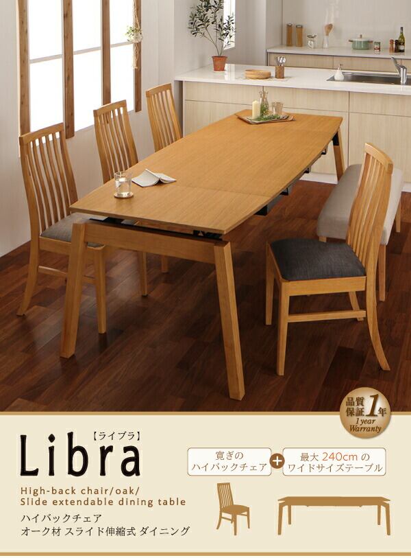 ハイバックチェア オーク材 スライド伸縮式ダイニング 5点セット(テーブル+チェア4脚) W140-240