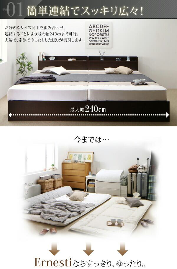 お客様組立 連結 棚・コンセント付すのこ収納ベッド スタンダードポケットルコイルマットレス付き A+Bタイプ ワイドK240(SD×2)