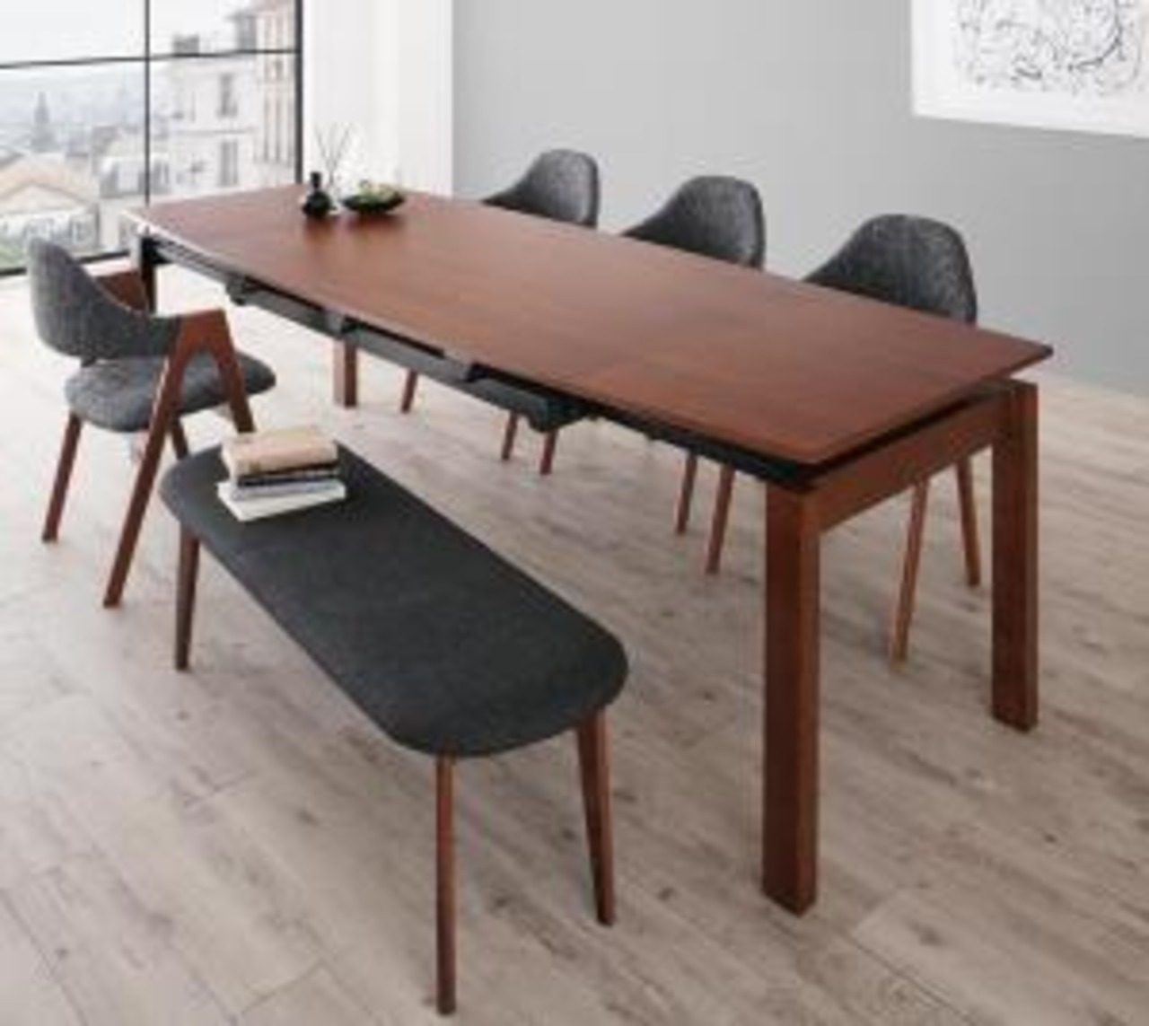北欧テイスト 天然木ウォールナット材 伸縮ダイニングセット 6点セット(テーブル+チェア4脚+ベンチ1脚) W140-240