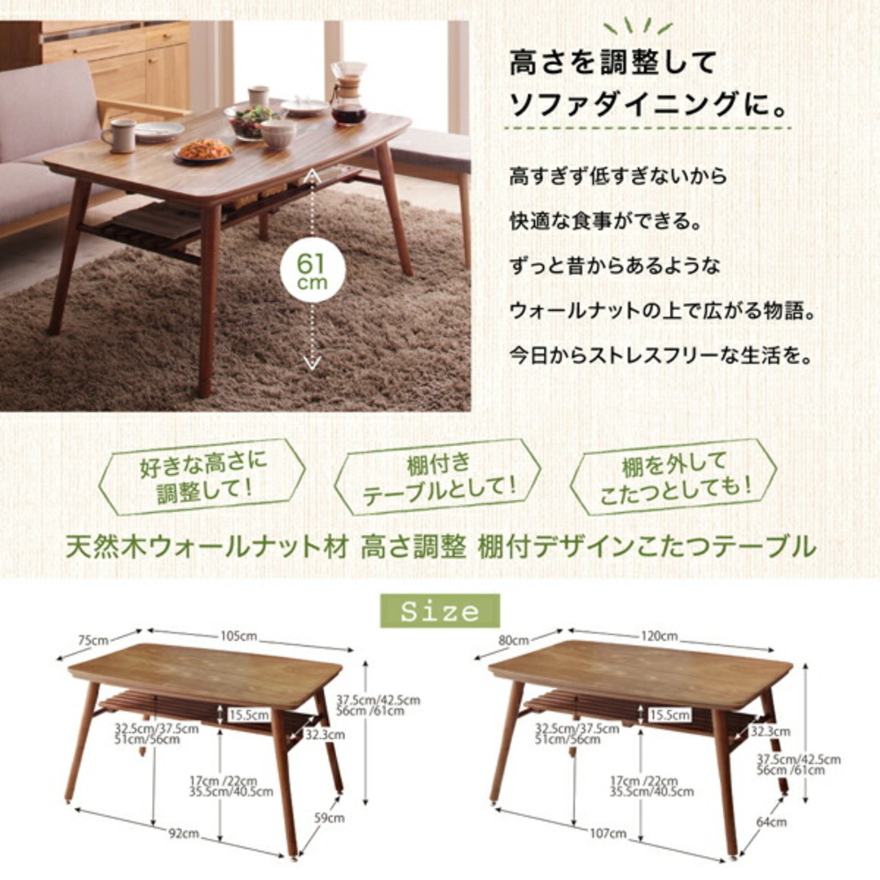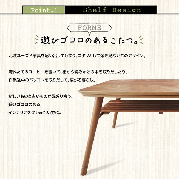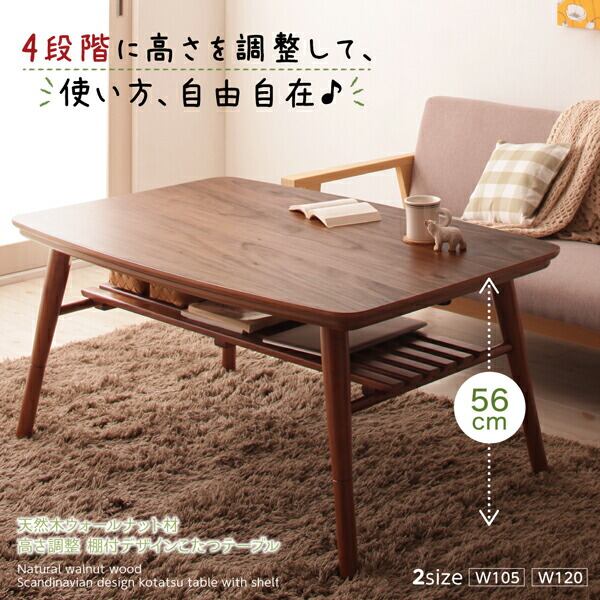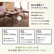 高さ調整 棚付きデザインこたつテーブルェ 長方形(75×105cm)
