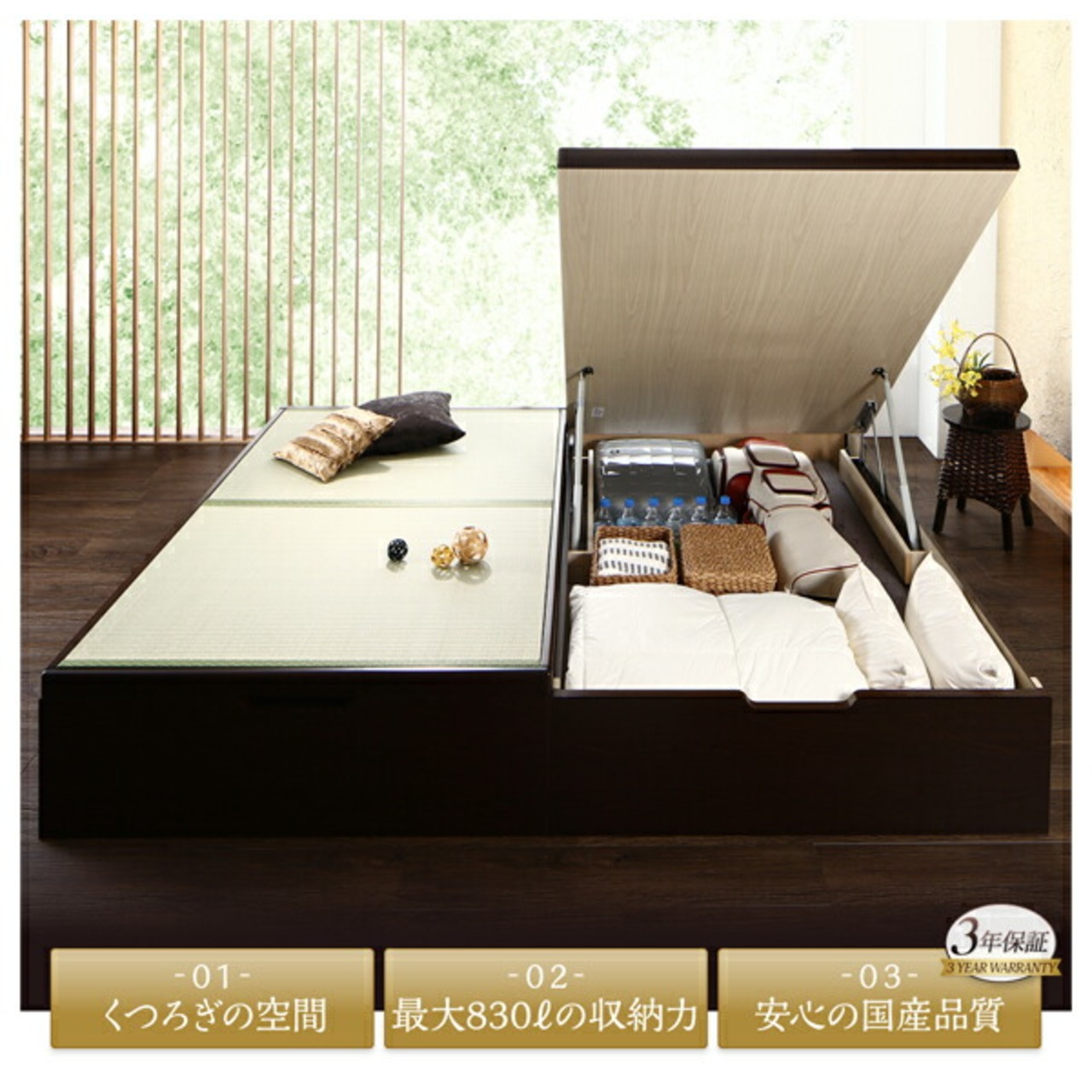 お客様組立の和空間をつくる日本製大容量収納ガス圧式跳ね上げ畳ベッド 国産畳 シングル 深さラージ