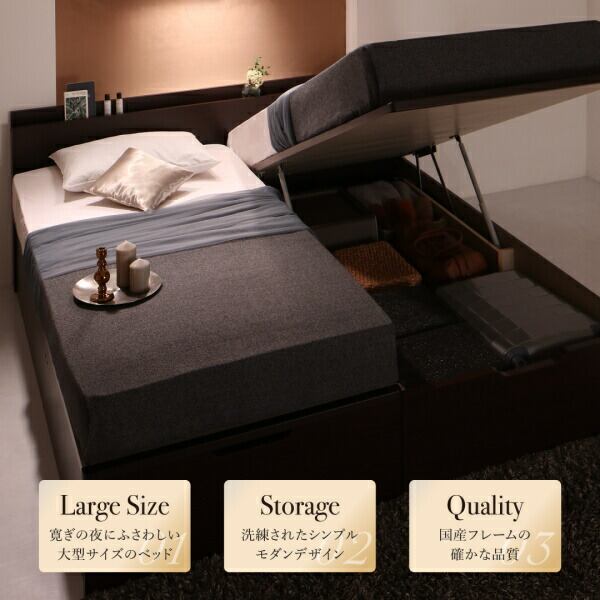 お客様組立 棚・コンセント付国産大型サイズ跳ね上げ収納ベッド ベッドフレームのみ 縦開き キング(SS+S)