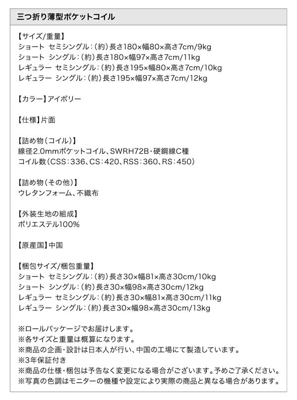 小さなベッドフレームにもピッタリ収まる。コンパクトマットレス プレミアムポケットコイル セミシングル ショート丈 厚さ17cm