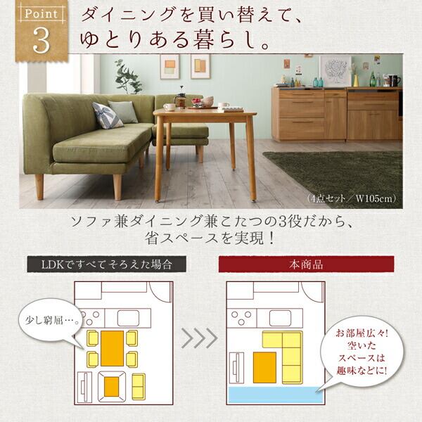 年中快適 こたつもソファも高さ調節 リビングダイニングセット 5点セット(テーブル+2Pソファ1脚+1Pソファ1脚+コーナーソファ1脚+ベンチ1脚) W120