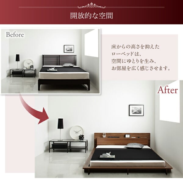 モダンライト・コンセント付き大型ローベッド スタンダードボンネルコイルマットレス付き セミダブル
