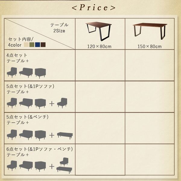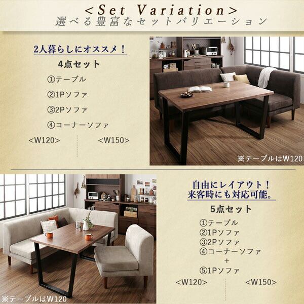 5点セット(テーブル+2Pソファ1脚+1Pソファ2脚+コーナーソファ1脚) W120