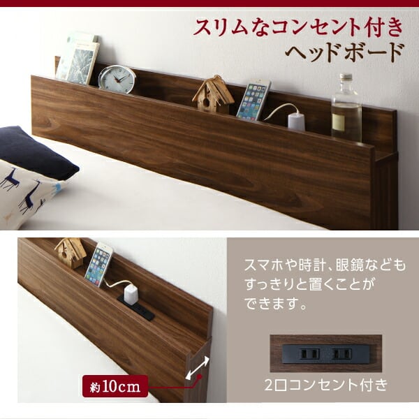 お客様組立 通気性抜群 棚コンセント付 跳ね上げすのこベッド 薄型スタンダードボンネルコイルマットレス付き 縦開き シングル 深さラージ