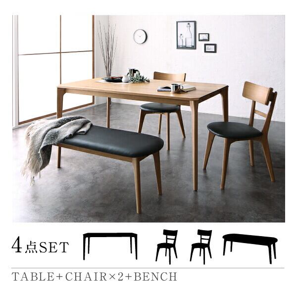 天然木オーク無垢材 モダンデザインダイニング 4点セット(テーブル+チェア2脚+ベンチ1脚) W150
