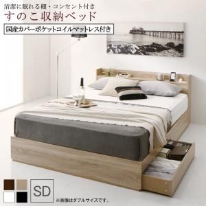 清潔に眠れる棚・コンセント付きすのこ収納ベッド 国産カバーポケットコイルマットレス付き セミダブル