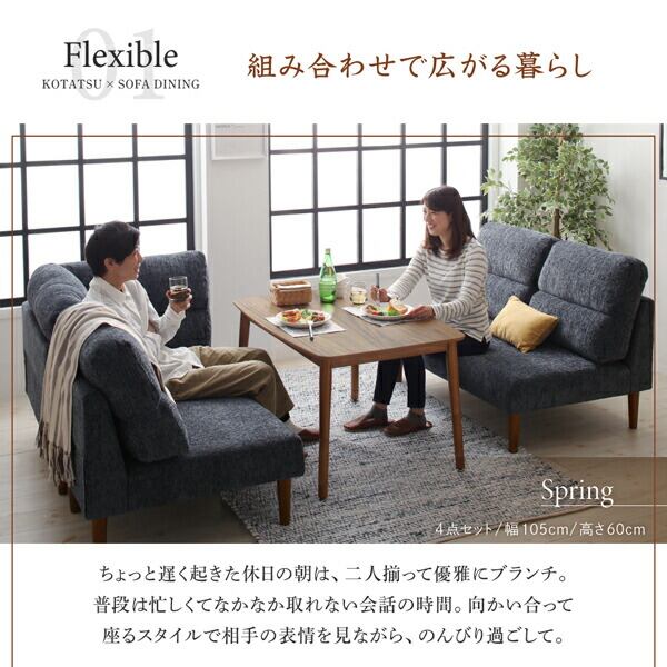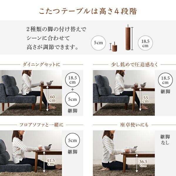 高さ調節可能 ハイバックこたつソファダイニング 4点セット(テーブル+2Pソファ1脚+1Pソファ1脚+コーナーソファ1脚) W120
