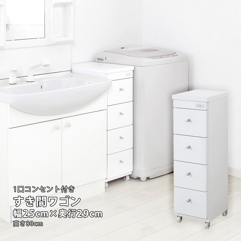すき間ワゴン すきまワゴン 洗面所 ランドリー 収納 日本製 完成品 キャスター付き コンセント 洗面所 ランドリー スリム ホワイト 白 幅25cm 奥行29cm