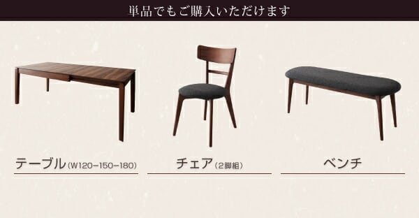 組立設置付き 天然木ウォールナットエクステンションダイニング 4点セット(テーブル+チェア2脚+ベンチ1脚) W120-180