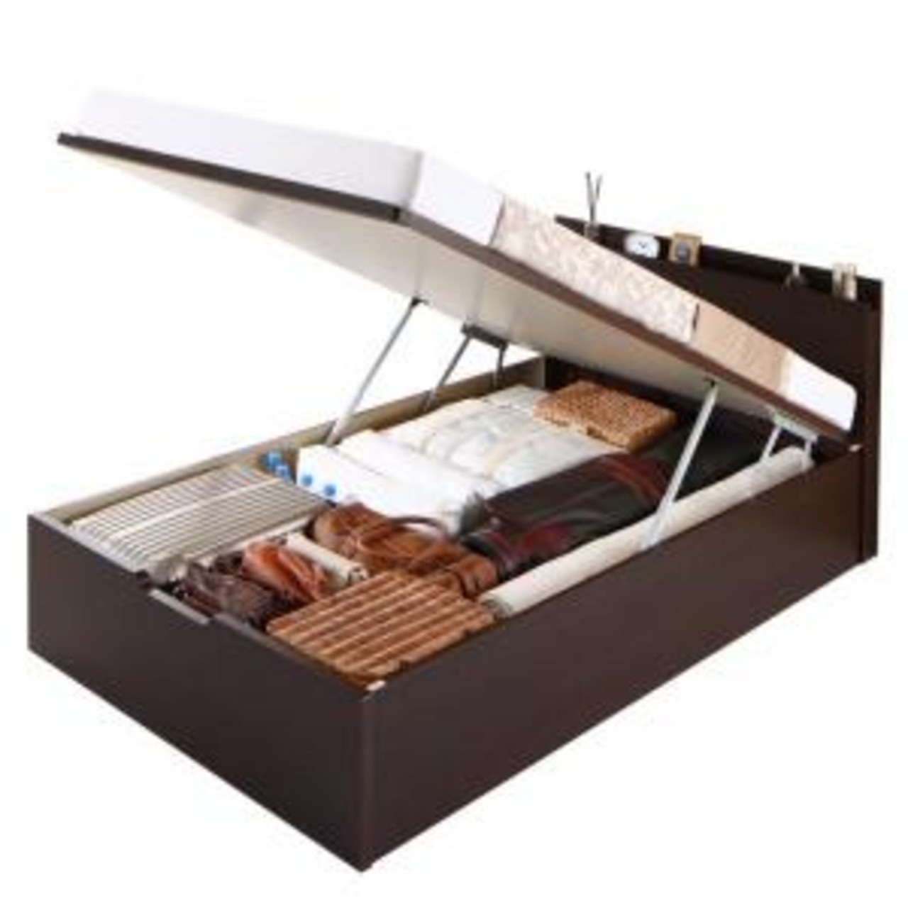 組立設置付 国産跳ね上げ収納ベッド ダークブラウン 薄型プレミアムボンネルコイルマットレス付き 縦開き シングル 深さグランド