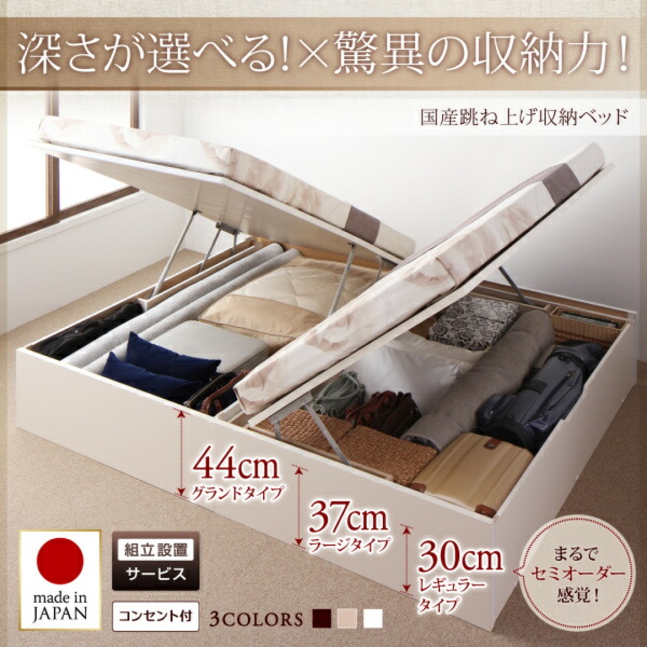組立設置付 国産跳ね上げ収納ベッド 薄型プレミアムポケットコイルマットレス付き 縦開き セミシングル 深さラージ