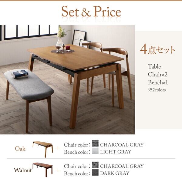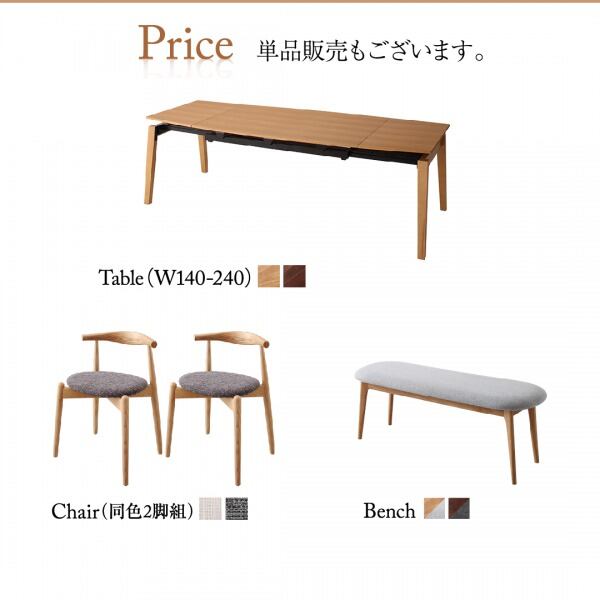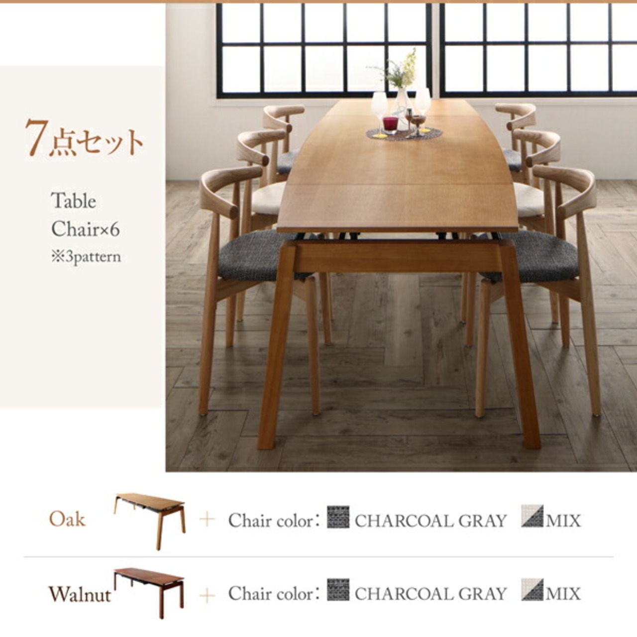 組立設置付き オーク材・ウォールナット材 北欧伸縮式ダイニング 7点セット(テーブル+チェア6脚) W140-240