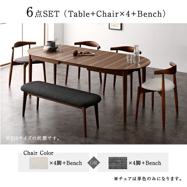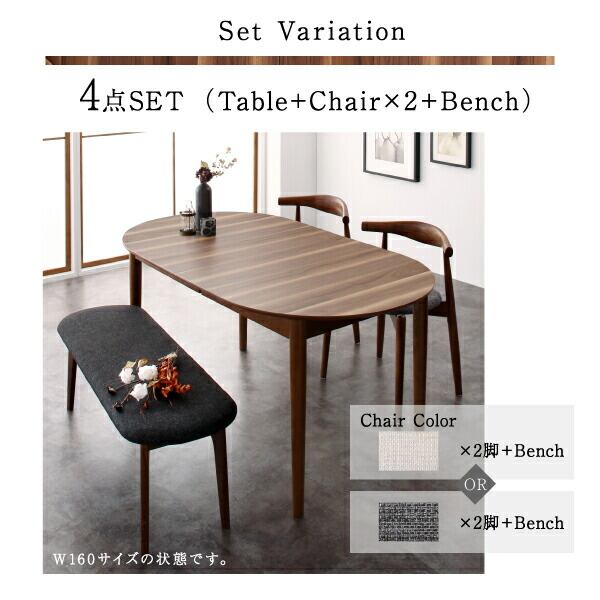 組立設置付き 天然木ウォールナット伸長式オーバルデザイナーズダイニング ベンチ 2P