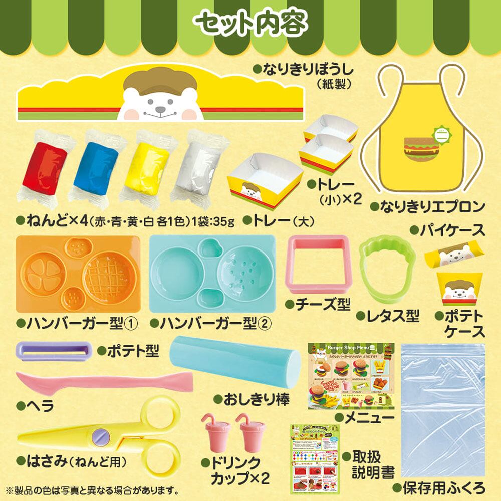 ・ねんど×4(赤・青・黄・白 各1色)1袋:35g・なりきりエプロン・なりきりぼうし(紙製)・ハンバーガー型(1)・ハンバーガー型(2)・ポテト型・チーズ型・レタス型・おしきり棒・ドリンクカップ×2・ヘラ・ねんど用はさみ・ふくろ(遊んだ後ねんどを保存します)・メニュー・トレー(大)/トレー(小)×2/ポテトケース/パイケース(紙製組み立て品)・取扱説明書