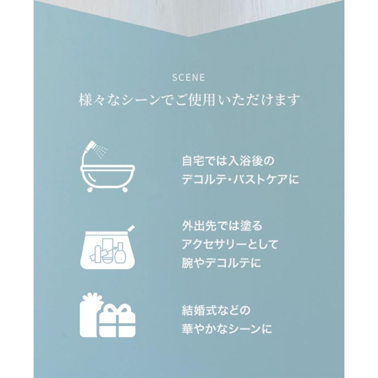 適量を手に取り、首筋からデコルテ、バストにかけてやさしくマッサージするようになじませてください。