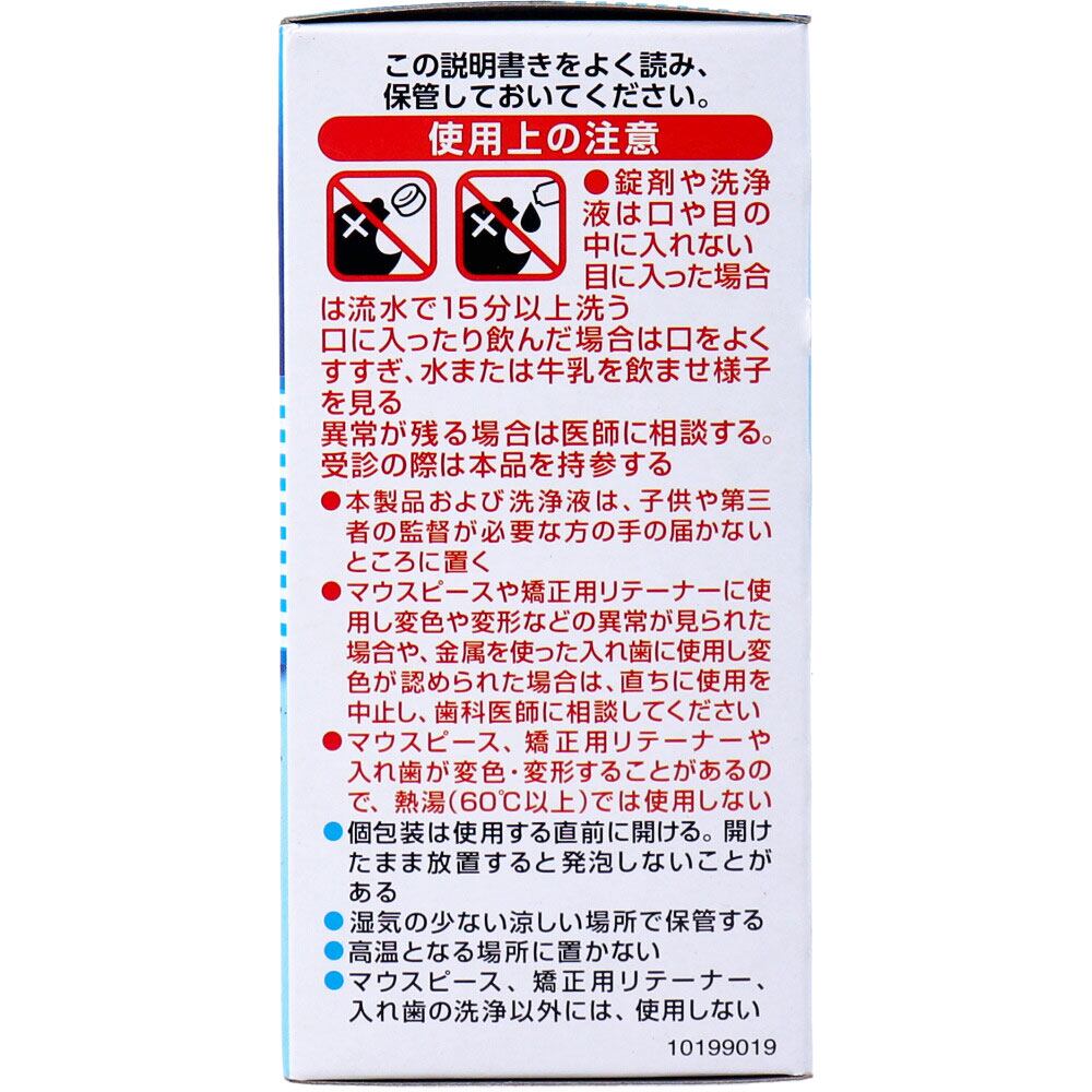 受診の際は本品を持参する・本製品および洗浄液は、子供や第三者の監督が必要な方の手の届かないところに置く・マウスピースや矯正用リテーナーに使用し変色や変形などの異常が見られた場合や、金属を使った入れ歯に使用し変色が認められた場合は、直ちに使用を中止し、歯科医師に相談してください・マウスピース、矯正用リテーナーや入れ歯が変色・変形することがあるので、熱湯(60度以上)では使用しない・個包装は使用する直前に開ける。