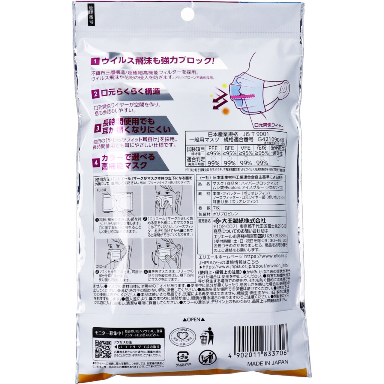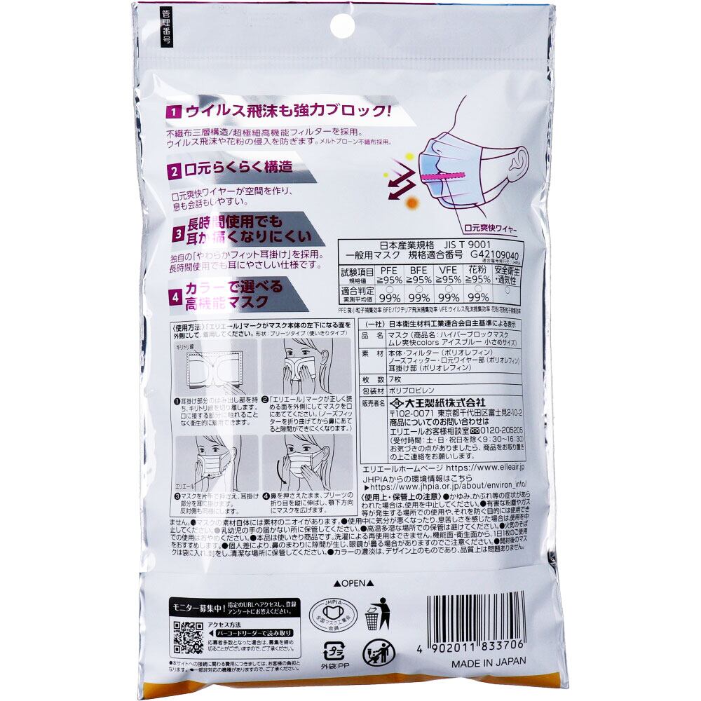 ・極細繊維のメルトブローン不織布採用。※フィルター捕集効率試験実施PFE(微粒子捕集効率試験):99%カットVFE(ウイルス飛沫ろ過試験):99%カットBFE(バクテリア飛沫ろ過試験):99%カット花粉捕集効率試験:99%カット