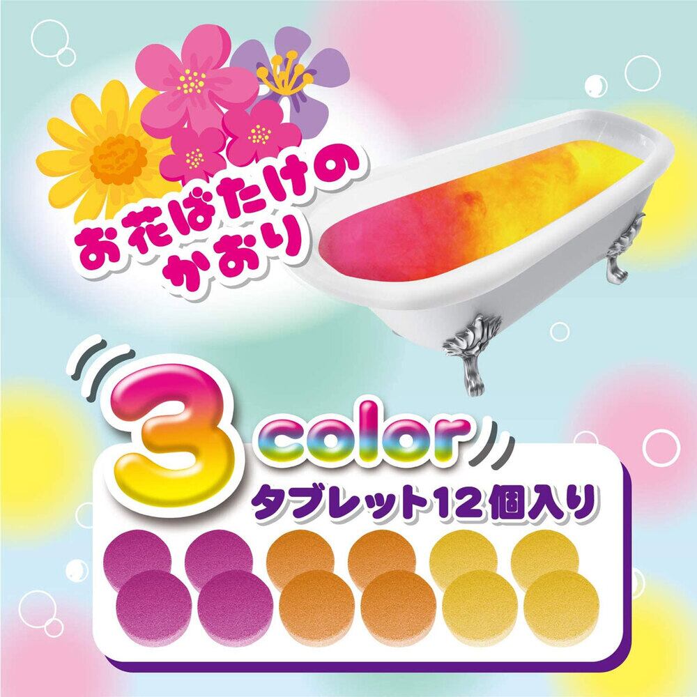 お風呂で知育。親子で楽しくコミュニケーション。色が変わるタブレット型の入浴剤12個(ピンク・オレンジ・きいろ:各4コ)入。お風呂の中で色の変化を楽しめます♪