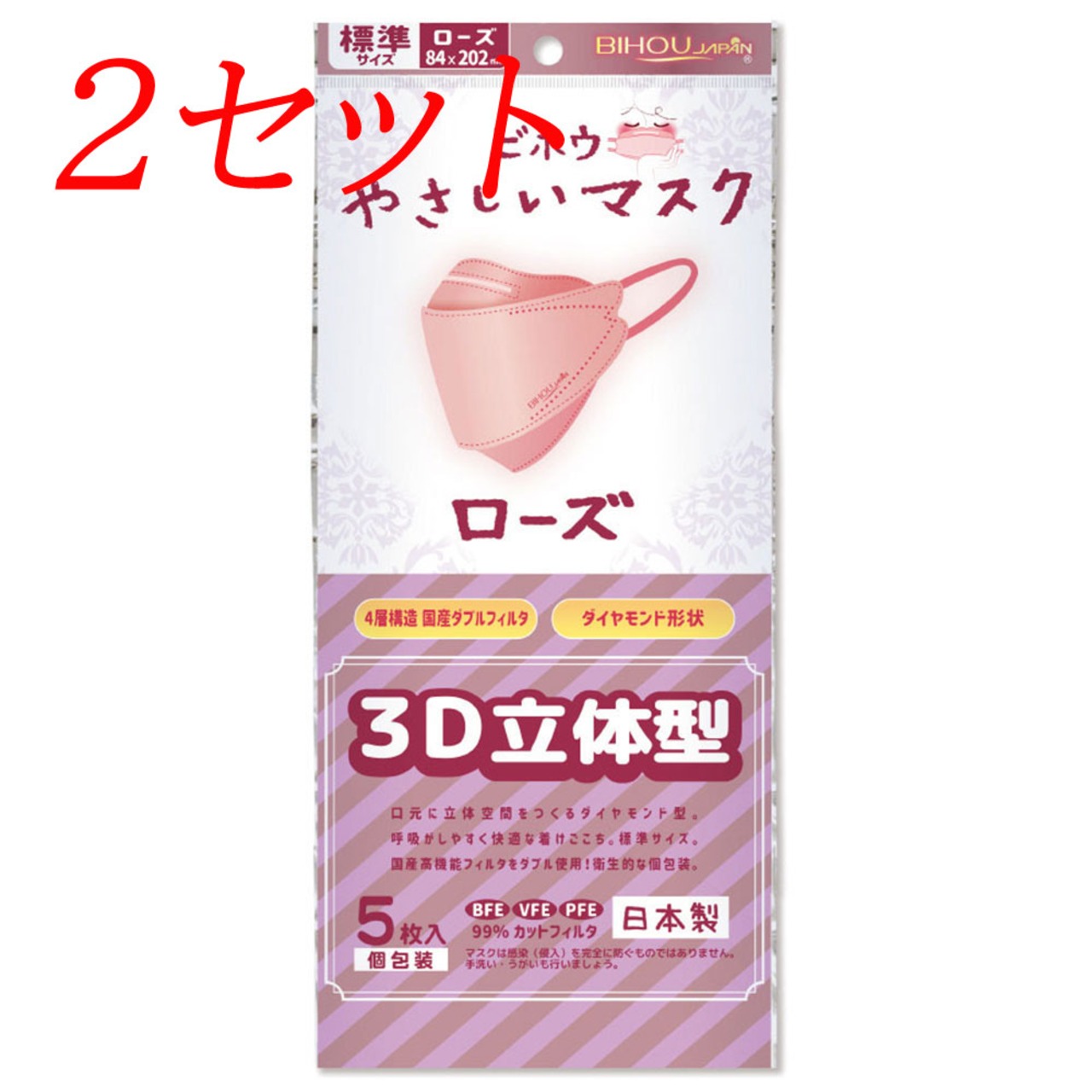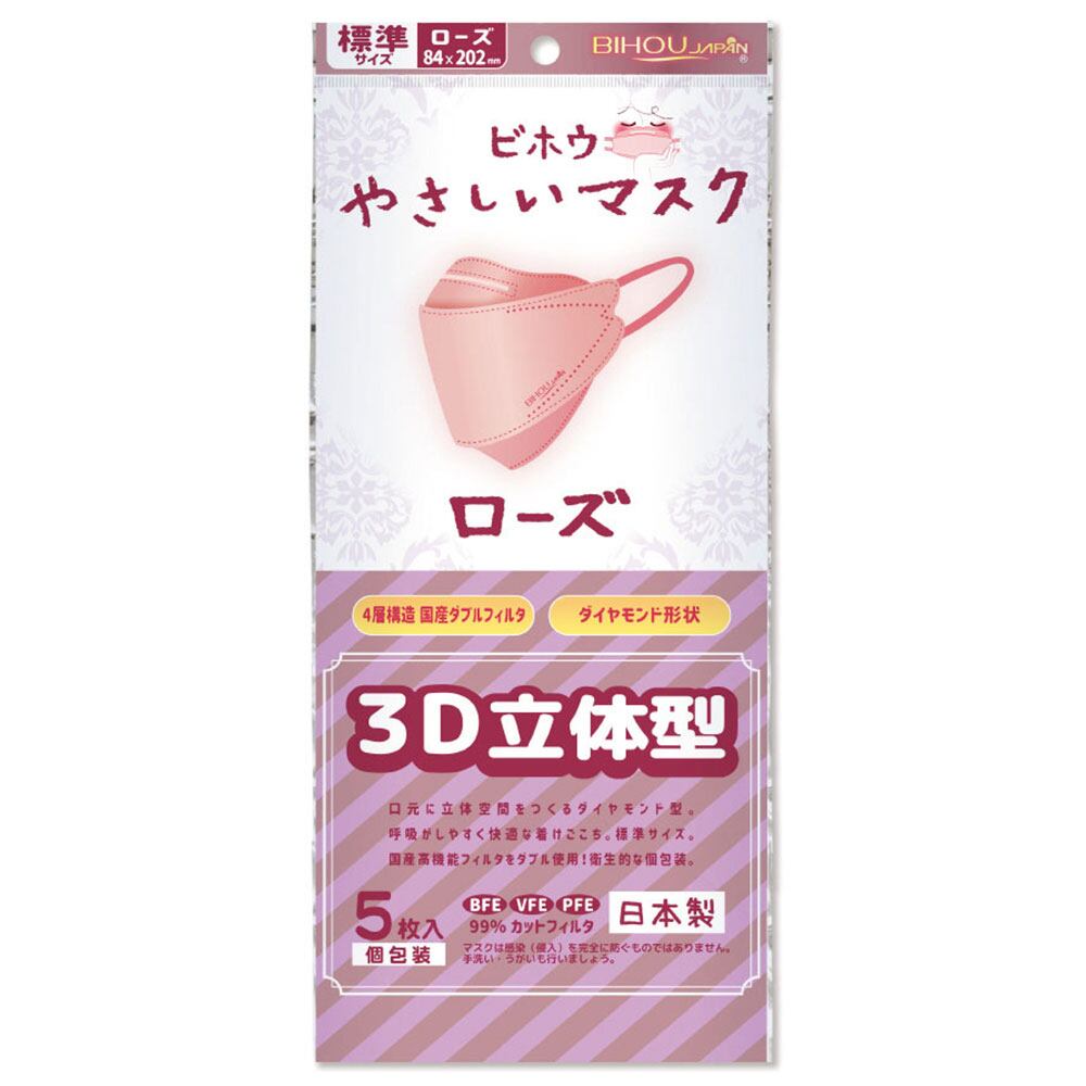 【2セット】 やさしいマスク 3D立体型 標準サイズ ローズ 個包装 5枚入 【pto】