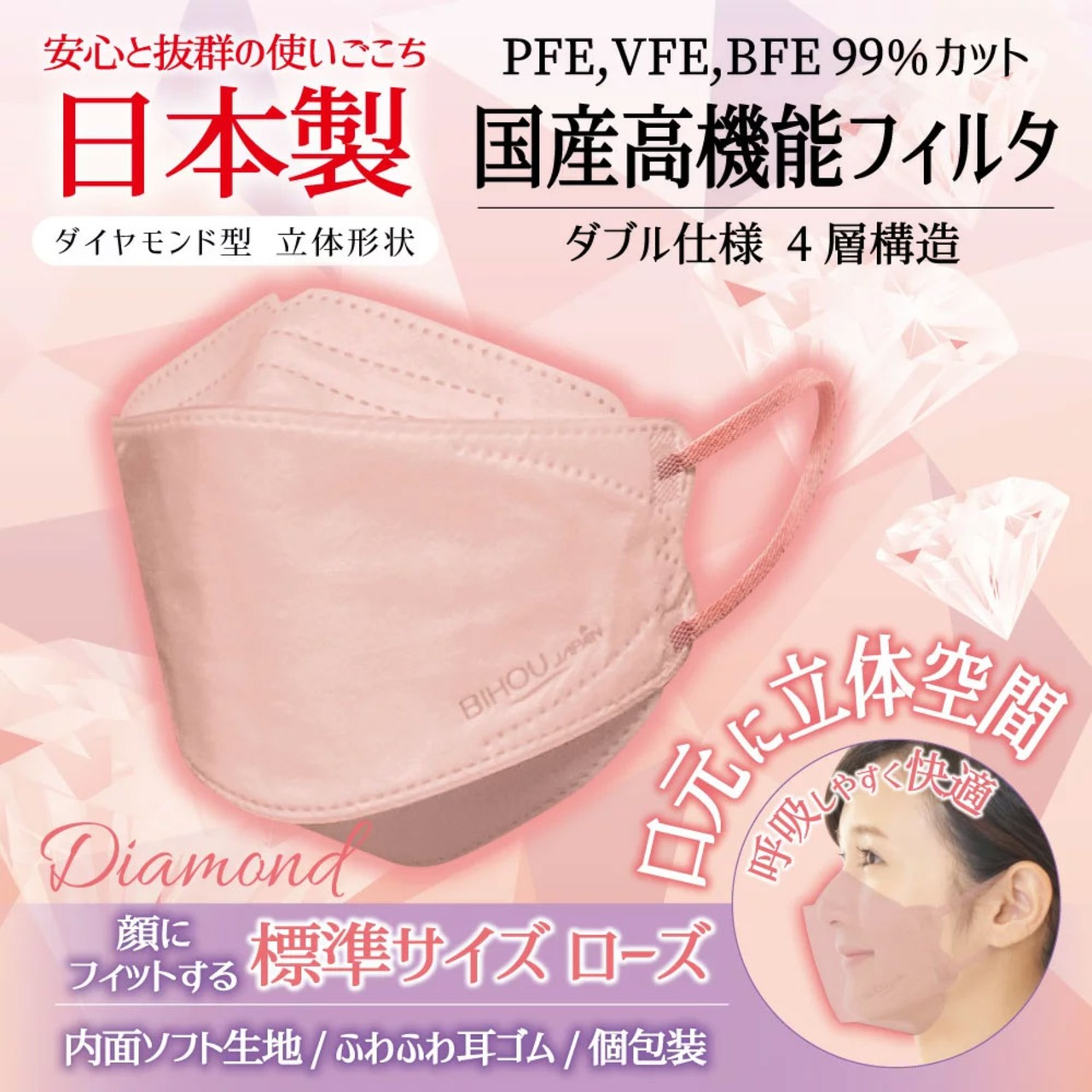 ダイヤモンド形状の呼吸しやすい3D立体型マスクです。