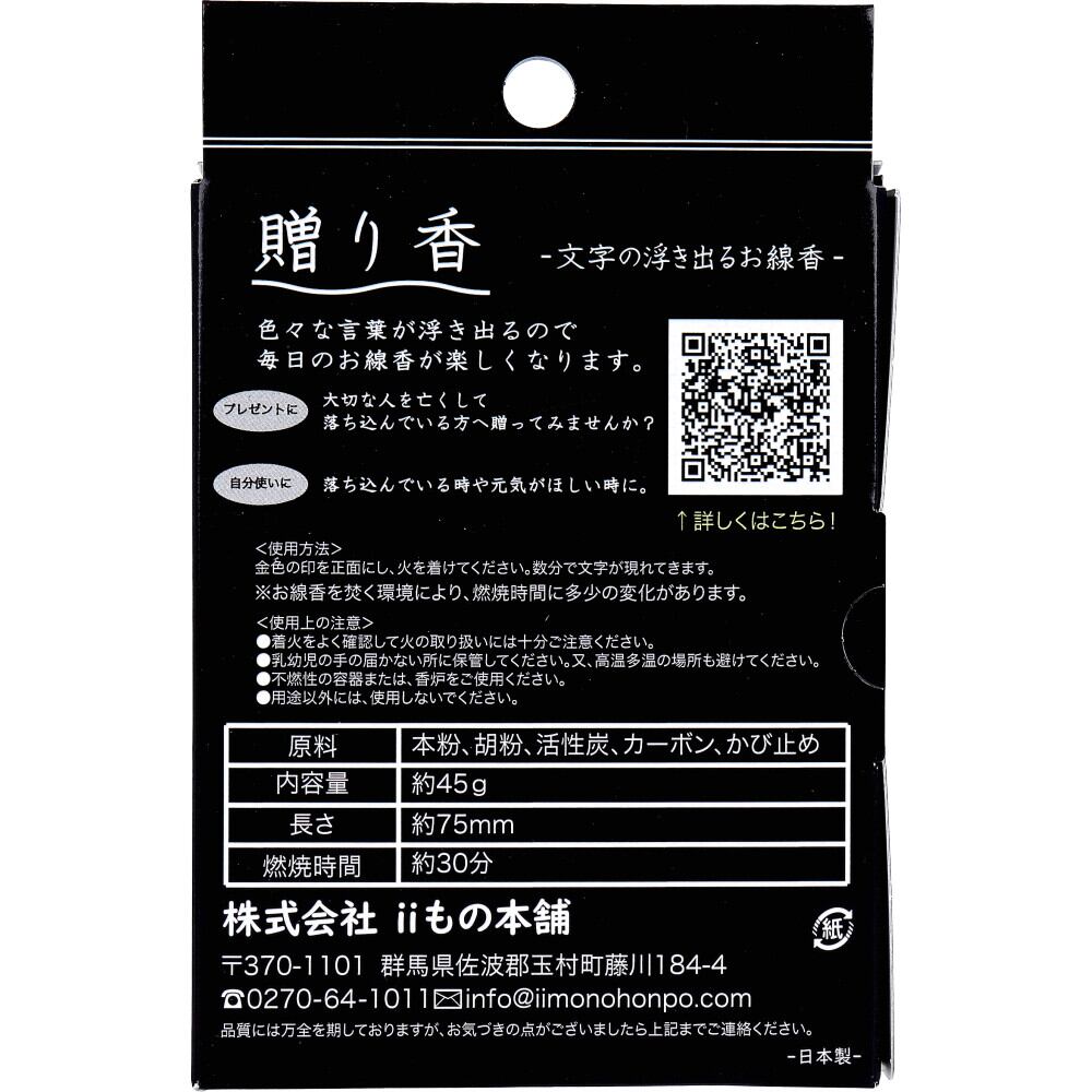 ●火を灯すと灰がそのまま残ってゆっくりと文字が浮き出てくるお線香です。