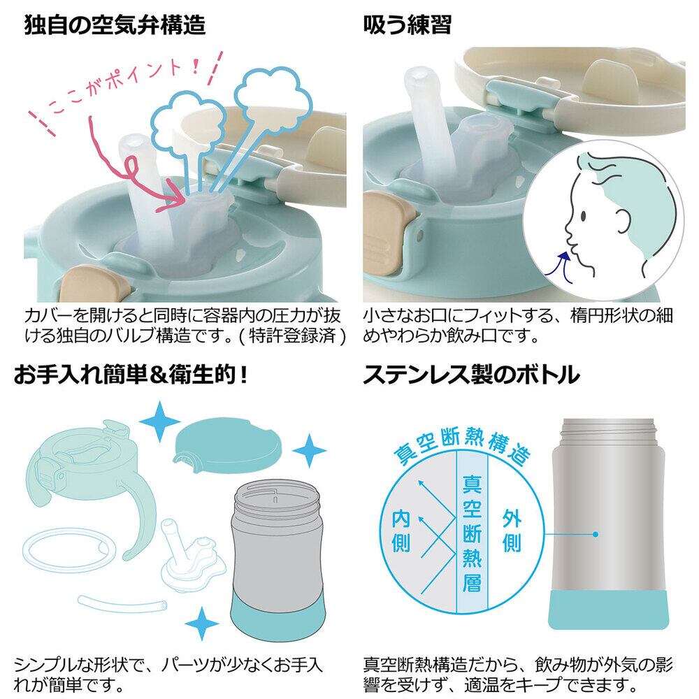 対象月齢:7カ月頃〜サイズ:11.5×7.5×15cm実容量:300mL材質:ステンレス鋼、シリコーンゴム食器洗い乾燥機:OK(ボトルを除く)煮沸・薬液消毒:OK(ボトルを除く)電子レンジ消毒:OK(ボトルを除く)