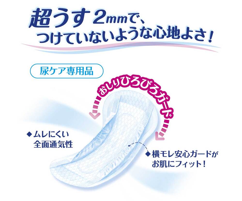 超うすなのに、安心の吸収力。「超うす」吸収体で、驚きのうすさと高い吸収性能を両立。圧倒的なつけ心地の良さを実感していただけます。