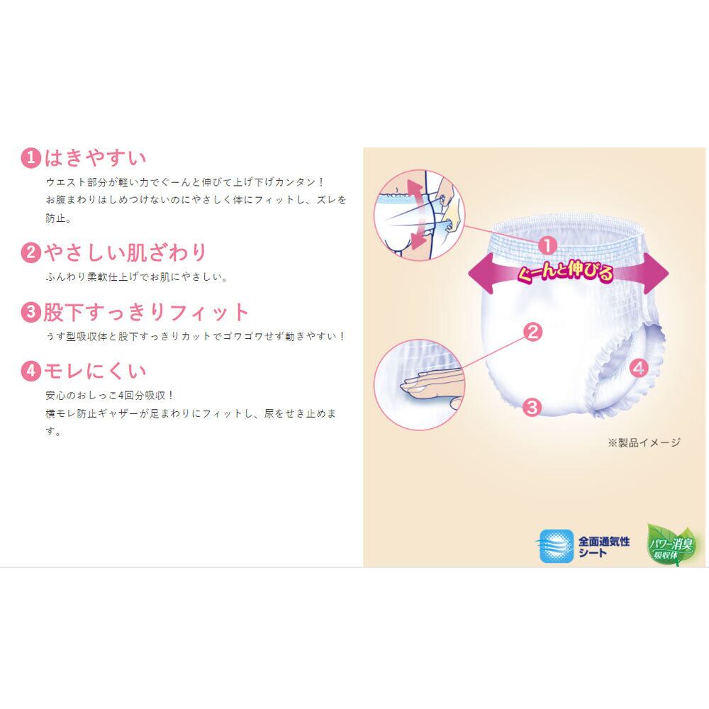 ●モレにくい安心のおしっこ4回分吸収。横モレ防止ギャザーが足まわりにフィットし、尿をせき止めます。<こんな方におすすめ>・介助があれば歩ける方に・介助があれば立てる・座れる方に