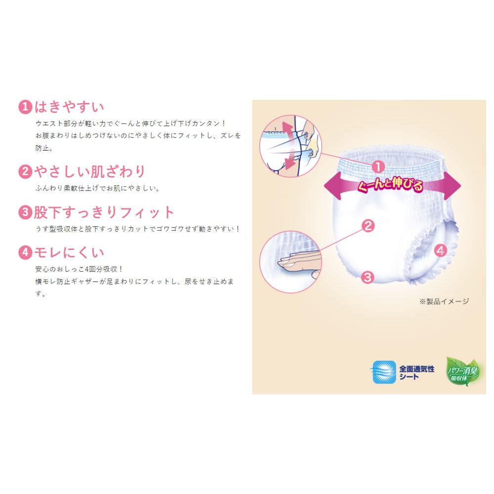 ●モレにくい安心のおしっこ4回分吸収。横モレ防止ギャザーが足まわりにフィットし、尿をせき止めます。