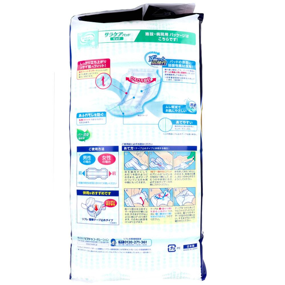 ●大型で安心。ひろびろ設計で体を包み込み、テープ止めタイプやおむつカバーに収まりやすい大きさです。