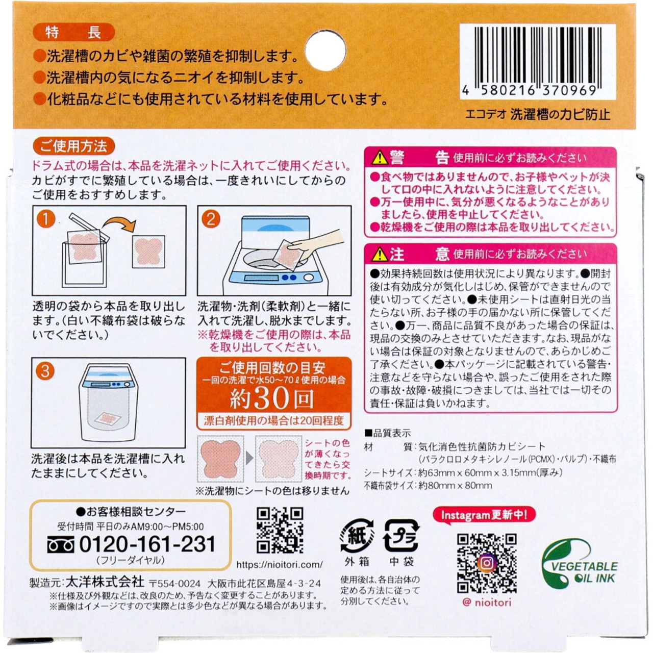 ※ご使用回数の目安:1回の洗濯で水50〜70L使用の場合 約30回(漂白剤使用の場合は20回程度)※シートの色が薄くなってきたら交換時期です。