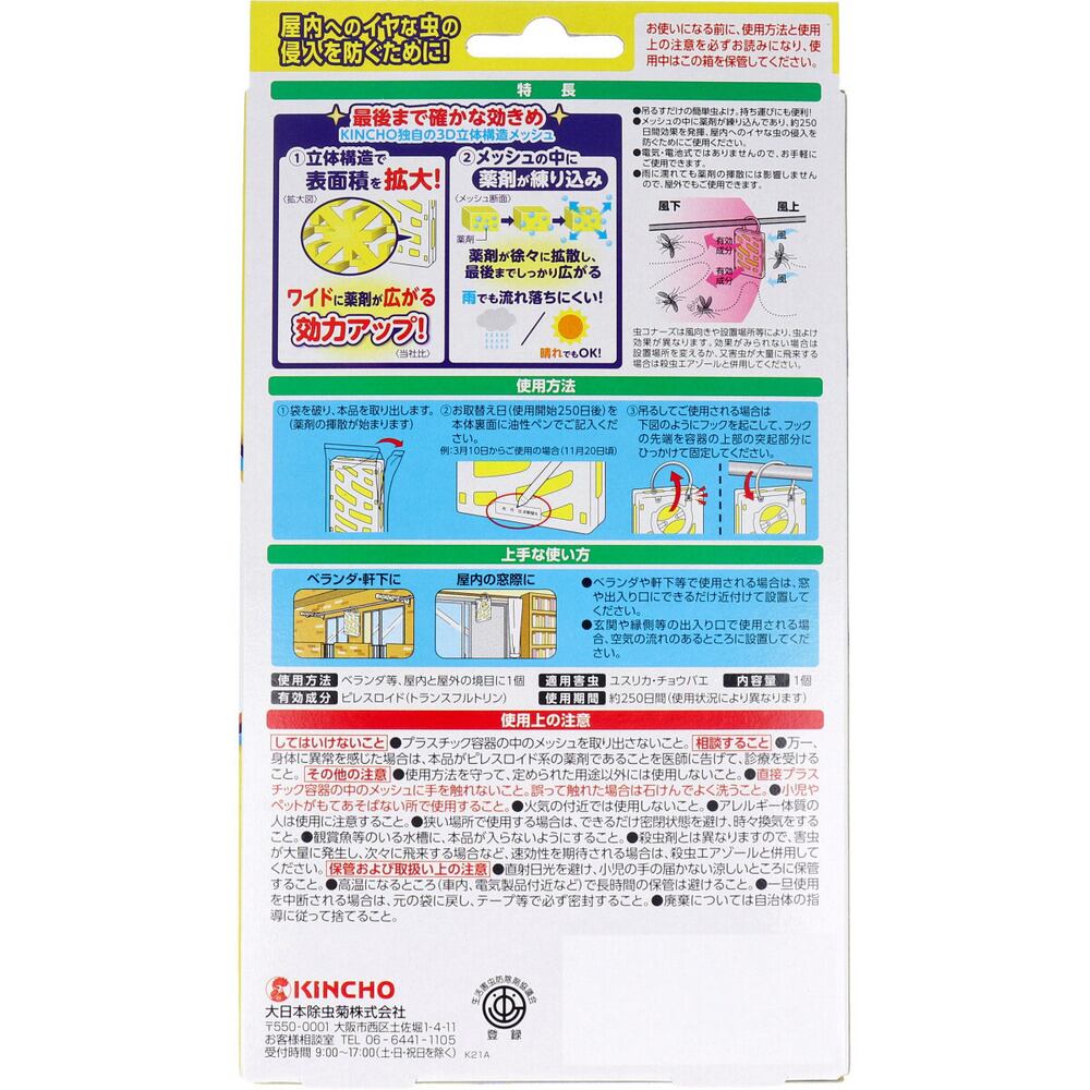 ・殺虫剤とは異なりますので、害虫が大量に発生し、次々に飛来する場合など、速効性を期待される場合は、殺虫エアゾールと併用してください。