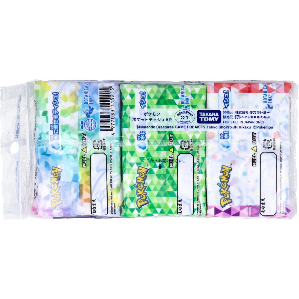 お子様の大好きな「ポケットモンスター」のキャラクタープリント入6パックティシュです。お子様のポケットに入る大きさです。
