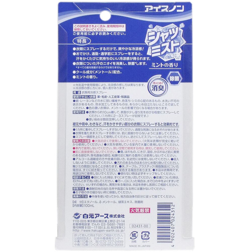 【2セット】 アイスノン シャツミスト ミントの香り 100mL 【pto】