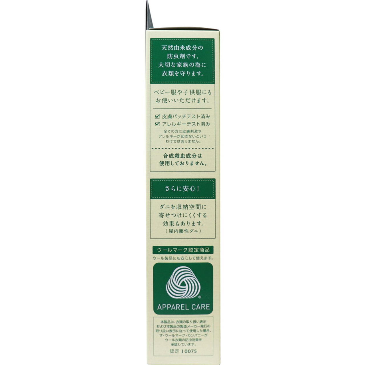天然由来成分が大切な衣類をせんいの虫から守ります。成分由来のさわやかな香りが収納空間に広がり、衣類をやさしく包みます。