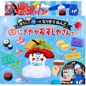 ・ねんど×4(赤・黄・白・黒 各1色)1袋:35g・なりきりエプロン・なりきりぼうし(紙製)・おすし型(1)・おすし型(2)・のり型・しゃり型・おさら・おわん・おしきり棒・ゆのみ×2・ヘラ・ねんど用はさみ・ふくろ(遊んだ後ねんどを保存します)・メニュー・おさらシート・紙小物・取扱説明書