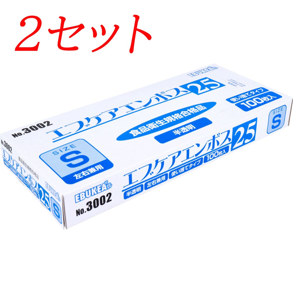 【2セット】 【業務用】No.3002 エブケアエンボス25 食品衛生法適合 使い捨て手袋半透明 Sサイズ 箱入 100枚入 【pto】