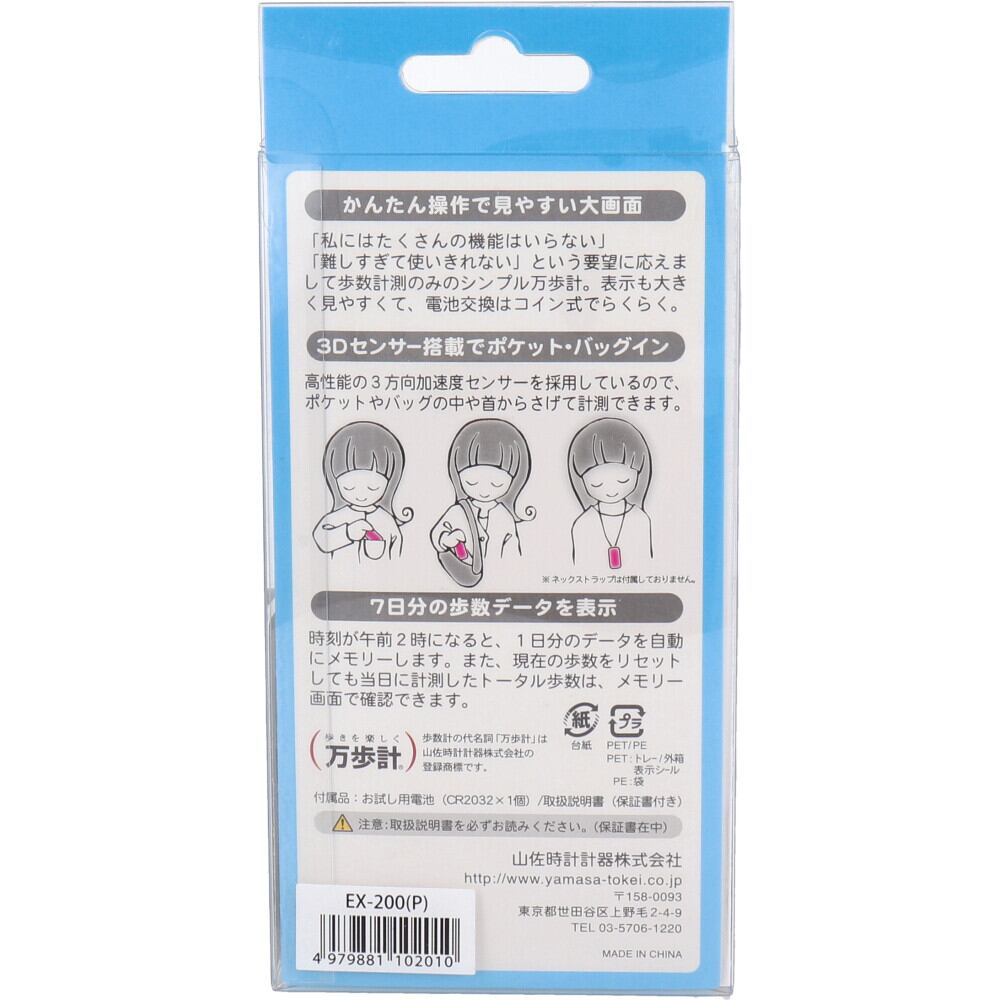 型番・・・EX-200カ ラ ー・・・スノーホワイト(W)・サクラピンク(P)・エコグリーン(G)外形寸法・・・60×33×11mm(幅/高/厚)質量・・・約20g(電池を含む)使用電池・・・CR2032電池1個電池寿命・・・約10ヶ月(1日1万歩または1日4時間使用にて)