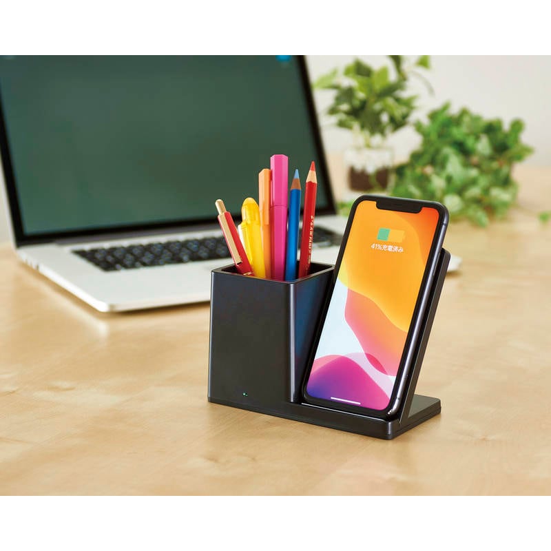 qi対応のスマートフォンを置くだけで充電ができる便利なペンホルダーの付いたワイヤレス充電器です。