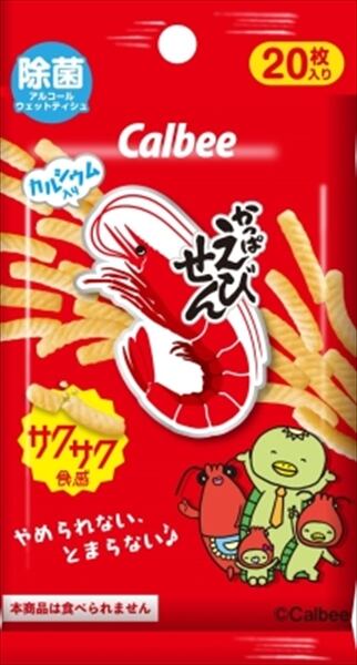 「やめられない、とまらない〜♪」でお馴染みのかっぱえびせんのパッケージが除菌アルコールウェットティシュになって登場。